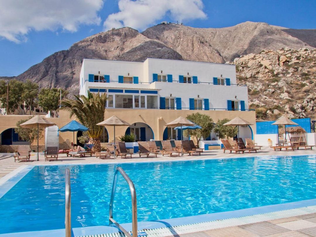 L’hotel si trova nella località di Perissa, a circa 500 metri dal centro. Nelle immediate vicinanze (circa 400 m) sono presenti supermercati, ristoranti, bar e locali notturni. La vivace Fira dista circa 10 km. L’aeroporto di Aeroporto di Santorini si trova a circa 13 km ed è collegato all’hotel tramite servizio navetta a pagamento. Per gli spostamenti sono disponibili fermate autobus e servizi di noleggio auto e motorini.