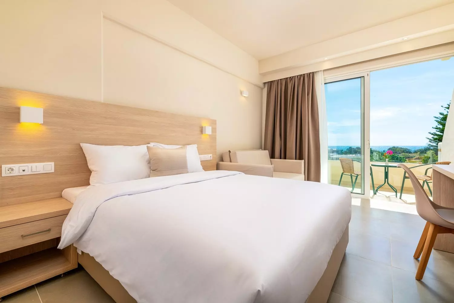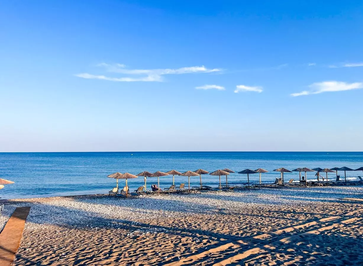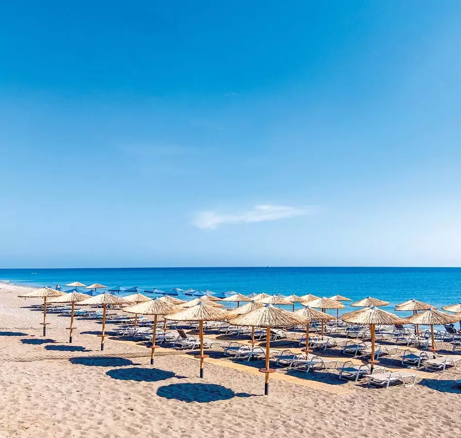 L’ampia spiaggia di sabbia e ciottoli di Afandou dista circa 300 metri, facilmente raggiungibile a piedi. A ogni camera sarà assegnato gratuitamente un ombrellone e due lettini. Teli mare gratuiti.